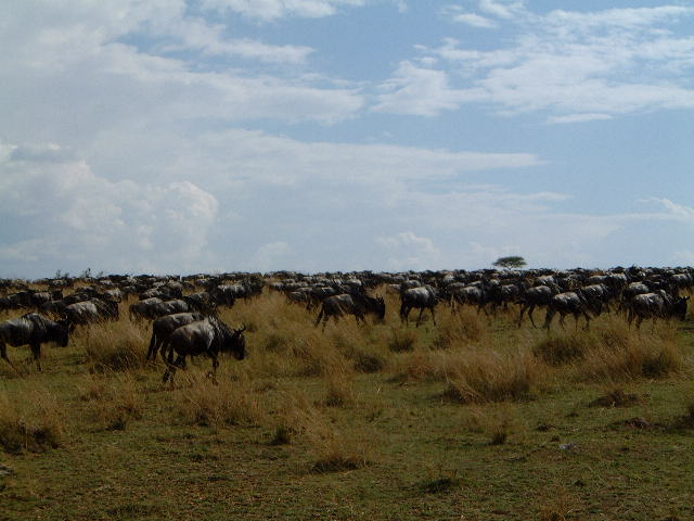 3)渡りはじめです。ヌーの列の川上、川下に居るのはカバです。